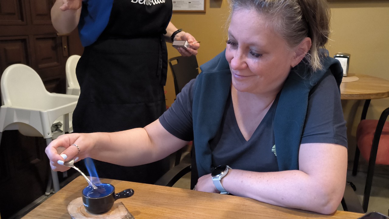 Elvileg 20 mp-enként meg kell kavarni 3x. Aztán elfújni, és gyorsan ledönteni. Már az első kavarás meglepetés volt, mert kivettem belőle a kanalat, és az is lángolt. Házigazdánk előzékenyen elfújta, de legalább már tudtam, mit kell tenni vele.